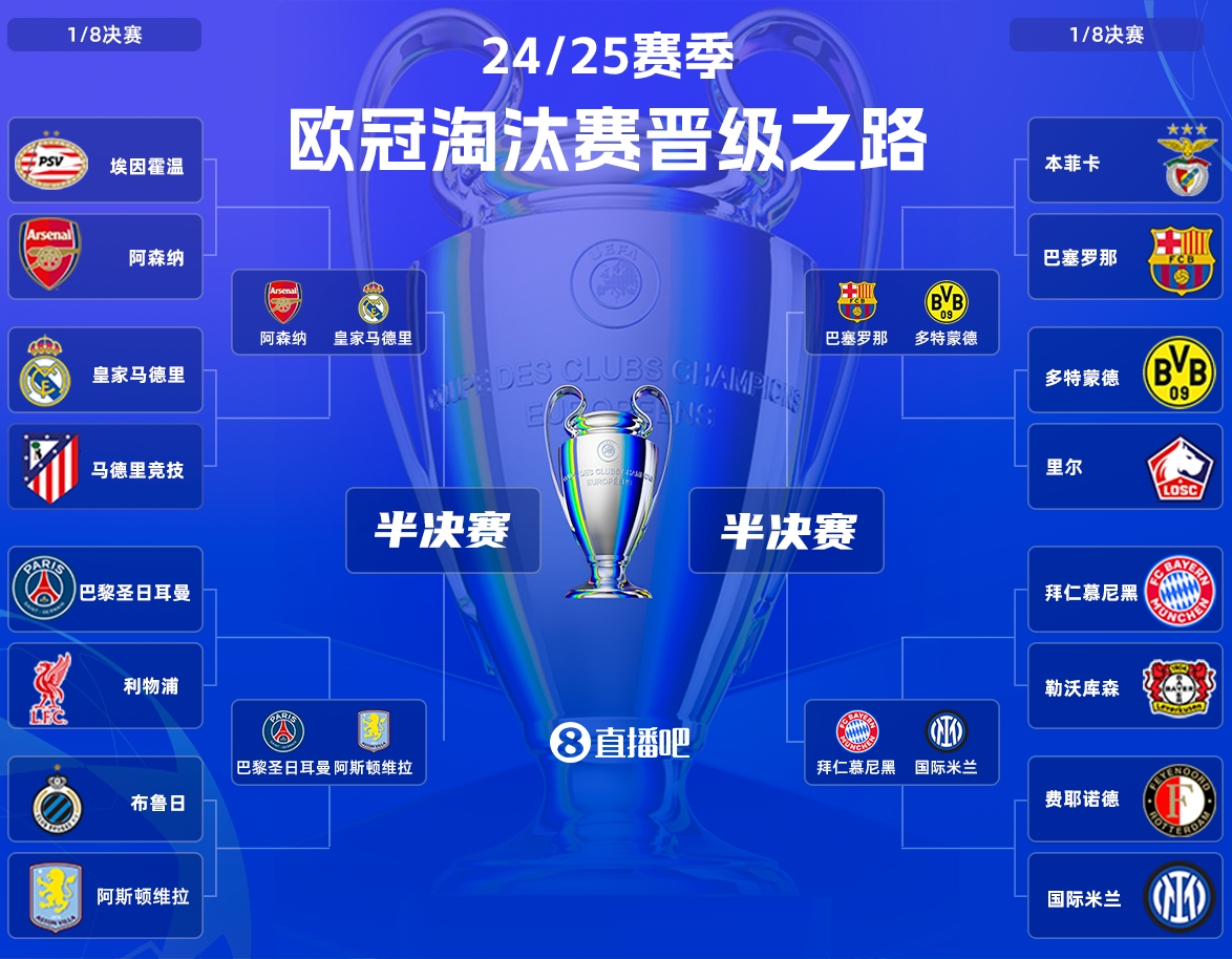 ??歐冠8強對陣:槍手vs皇馬|拜仁vs國米|巴薩vs多特|巴黎vs維拉