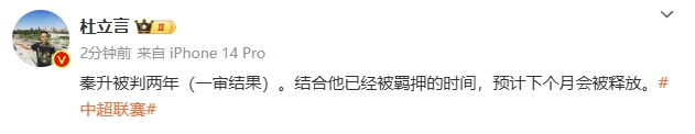 媒體人杜立言消息,秦升被判兩年(一審結(jié)果)。結(jié)合他已經(jīng)被羈押的時間,預計下個月會被釋放。